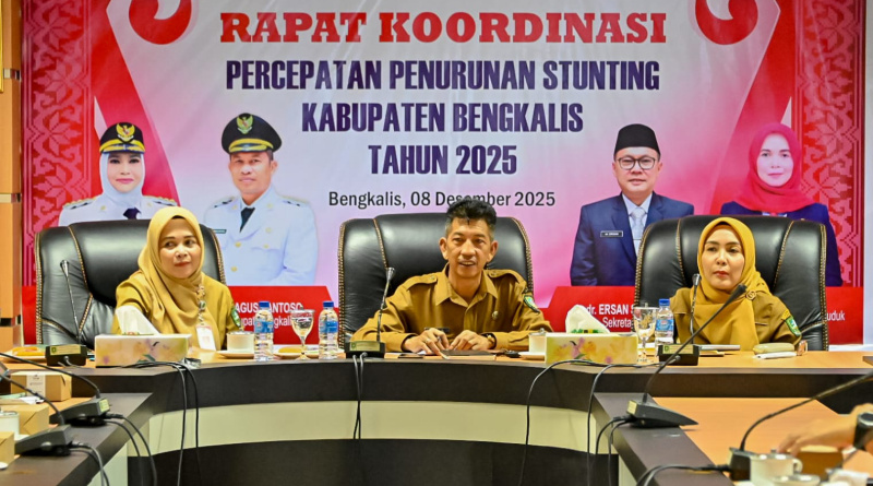 BENGKALIS- Pemerintah Kabupaten (Pemkab) Bengkalis terus memperkuat komitmennya dalam upaya percepatan penurunan stunting. Hal ini ditegaskan melalui Rapat Koordinasi (Rakor) Percepatan Penurunan Stunting yang dibuka oleh Bupati Bengkalis Kasmarni, diwakili Staf Ahli Bupati Bidang Kemasyarakatan dan SDM, Johansyah Syafri, Senin (8/12/25) di Ruang Rapat Hang Tuah Kantor Bupati Bengkalis.Rakor tersebut menjadi momentum penting untuk menyelaraskan langkah lintas sektor, guna memperkuat intervensi spesifik maupun sensitif dalam rangka menekan angka stunting di Kabupaten Bengkalis. Upaya ini sejalan dengan target nasional dan arahan Presiden RI terkait percepatan penurunan stunting.