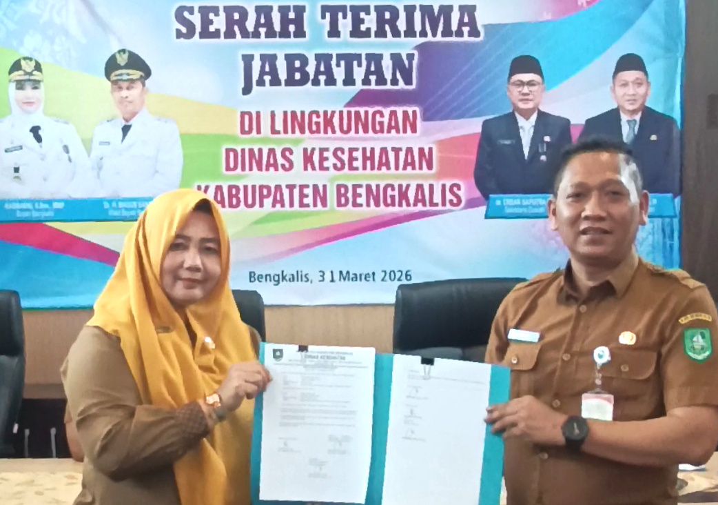 BENGKALIS – Dinas Kesehatan (Dinkes) Kabupaten Bengkalis menggelar serah terima jabatan (sertijab) sejumlah pejabat struktural dan Kepala UPT Puskesmas, Selasa (31/3/26).Kegiatan yang berlangsung di Aula Rapat Kantor Dinkes Bengkalis, Jalan Pertanian itu dipimpin langsung oleh Kepala Dinas Kesehatan Bengkalis, Ermanto, serta dihadiri Sekretaris Dinkes, Hj. Akna Juita, jajaran pejabat struktural, dan para Kepala UPT Puskesmas.