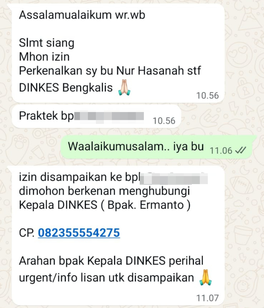 Kepala Dinas Kesehatan (Dinkes) Kabupaten Bengkalis, Ermanto, menegaskan bahwa pihaknya tidak pernah meminta masyarakat ataupun jajarannya dan pihak manapun untuk menghubungi nomor pribadi tertentu terkait urusan dinas yang mencurigakan.