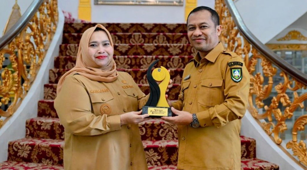 BENGKALIS- Wakil Bupati Bengkalis H. Bagus Santoso menyerahkan Penghargaan Apresiasi Pemerintah Daerah Berprestasi Tahun 2026 kepada Bupati Bengkalis Kasmarni, di Wisma Sri Mahkota Bengkalis, Selasa (28/4/26).Penghargaan tersebut sebelumnya diterima Wakil Bupati saat mewakili Bupati Bengkalis dalam kegiatan Apresiasi Pemerintah Daerah Berprestasi yang diselenggarakan di Palembang, pada Sabtu (25/4/26).